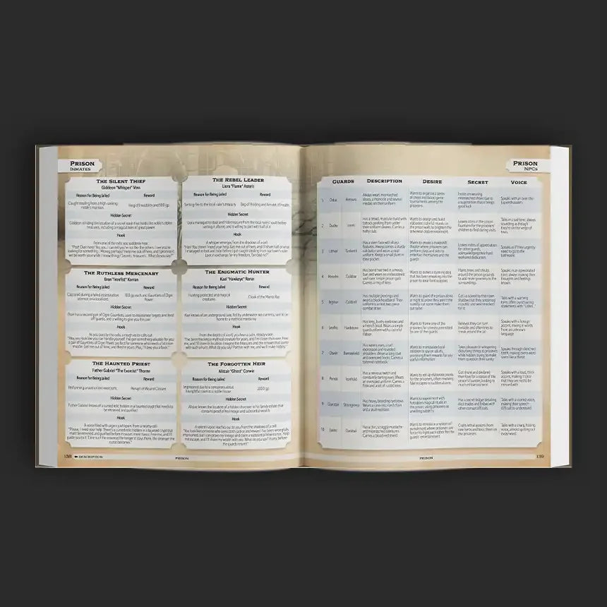 Do your players require some extra coin, healing potions or a special item for their next big quest? Several locations in the book have notice boards with small quests on them. Have your players embark on a mini adventure that comes with quick narrative descriptions, challenges, plot twists and unique rewards!